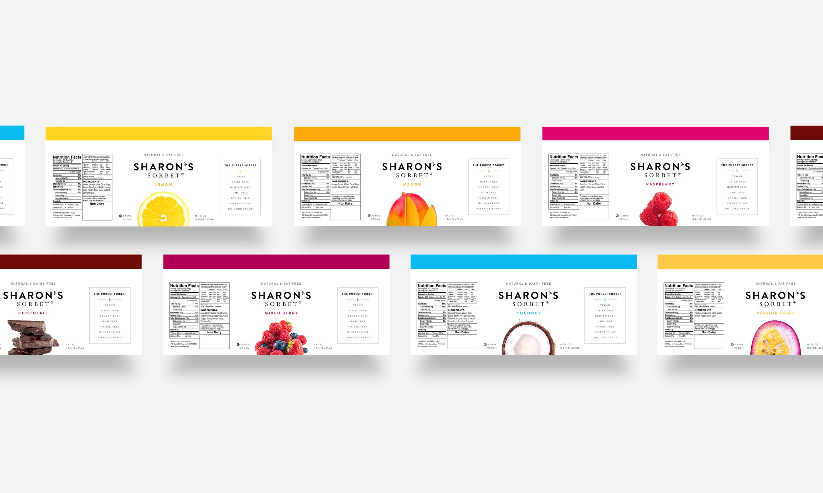 Sharon’s Sorbet is a non-dairy frozen dessert brand dedicated to simple, natural ingredients. The project involved a comprehensive brand identity overhaul, including a new logo and packaging for their seven-flavor lineup.