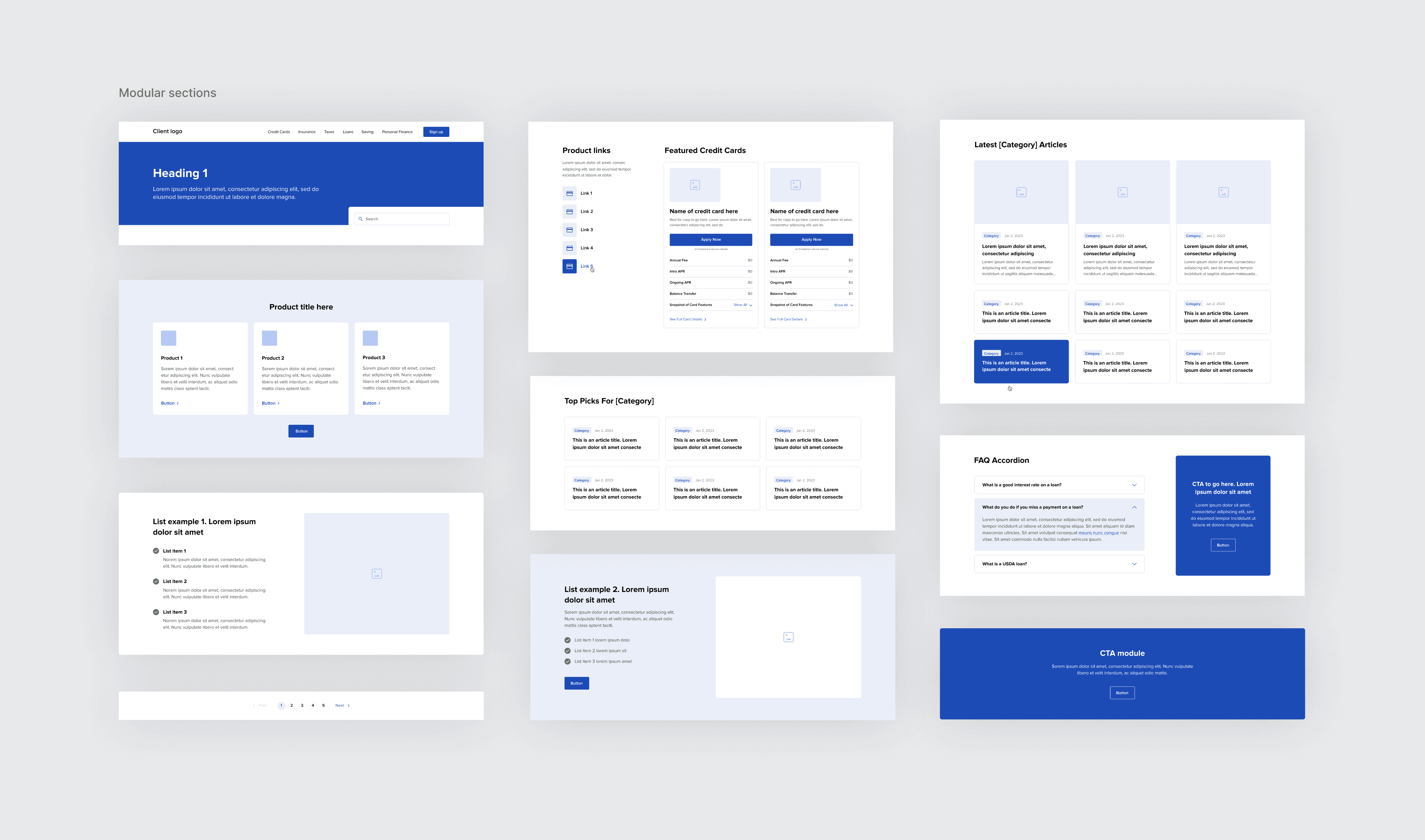 I designed a flexible design system of interchangeable sections—including CTAs, accordions, product cards, article cards, and review modules—specifically built to be rearranged based on the page's unique narrative. This modular system provided the client with a 'future-proof' wireframe foundation that would be ready for high-fidelity implementation.