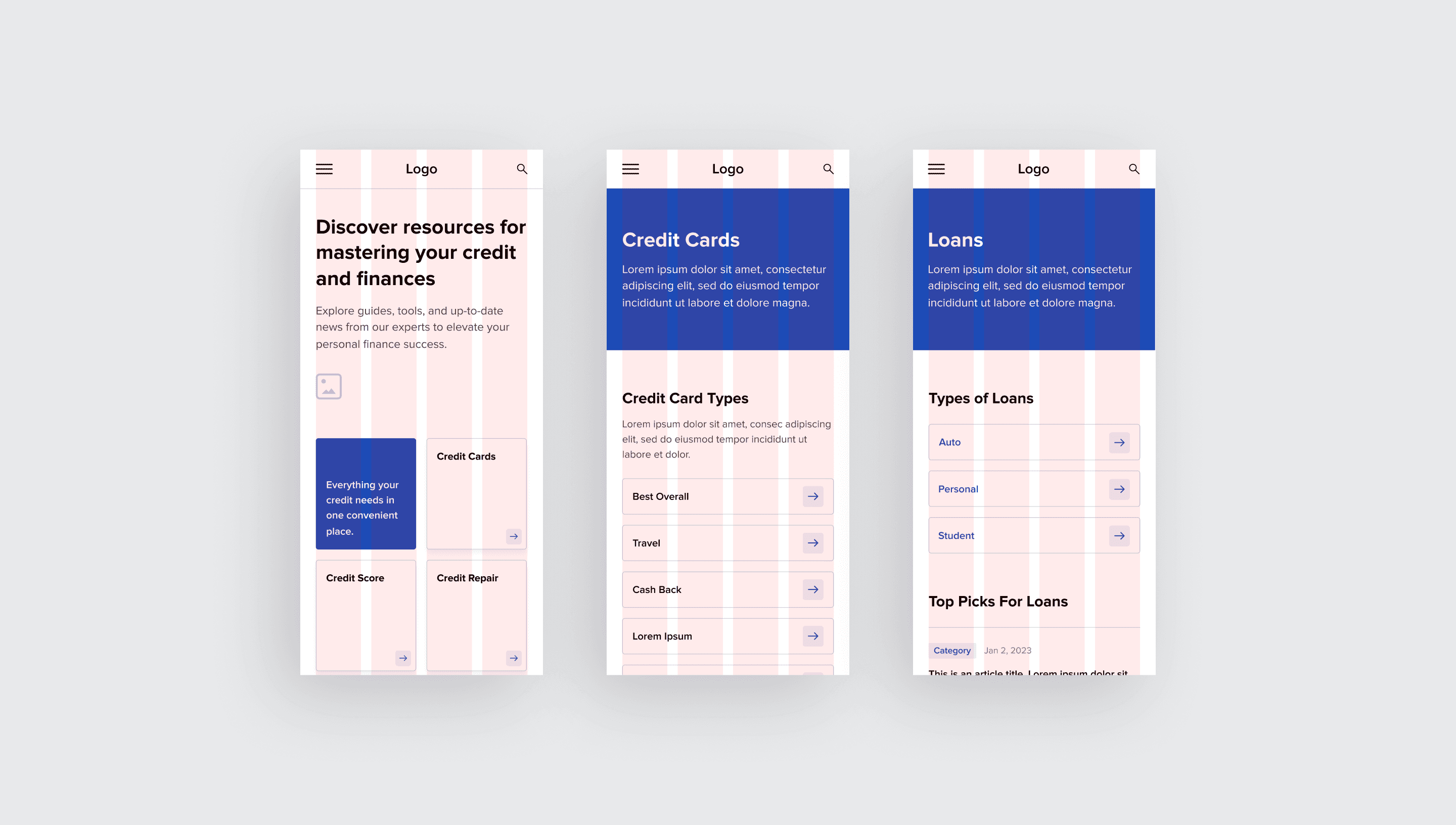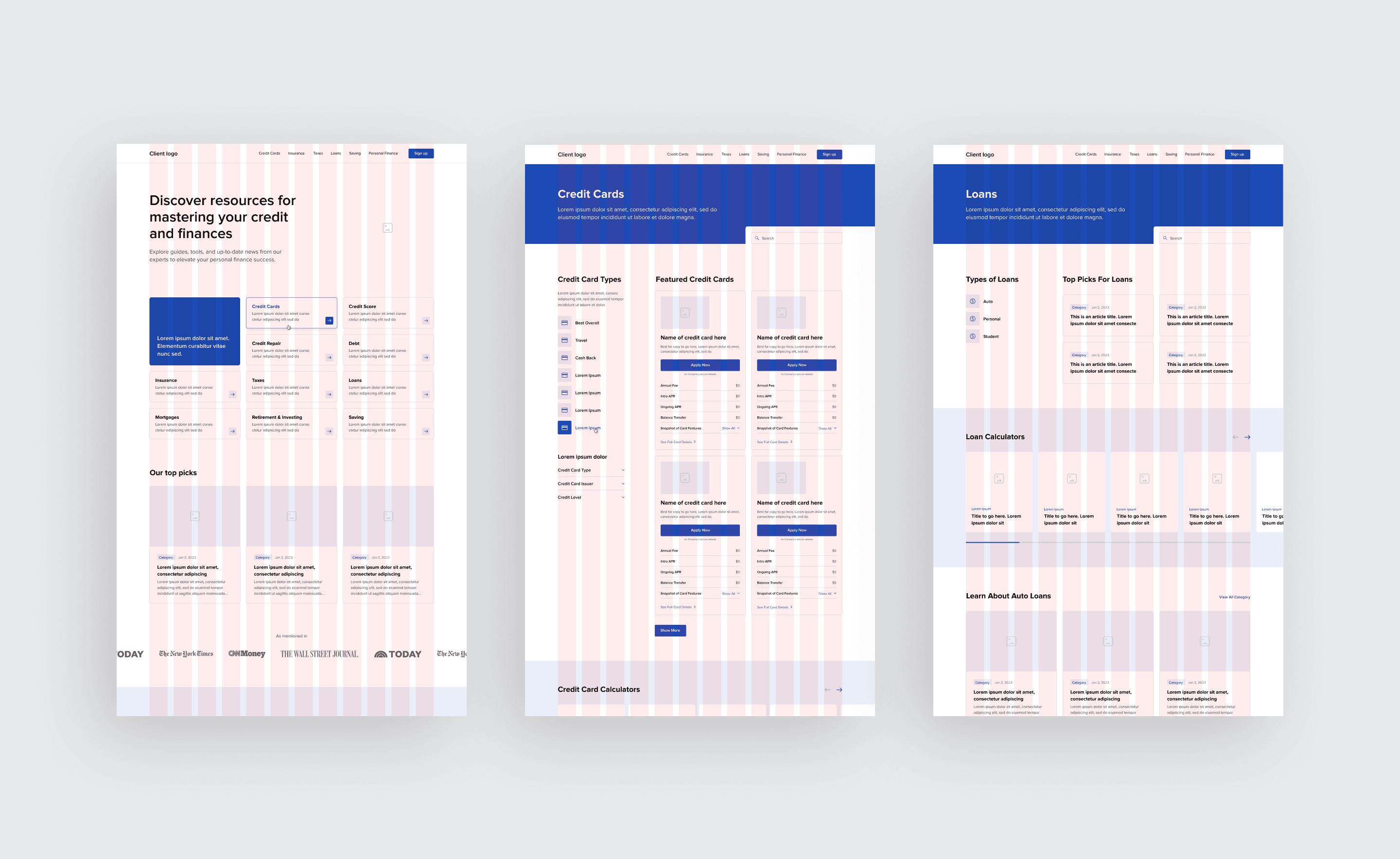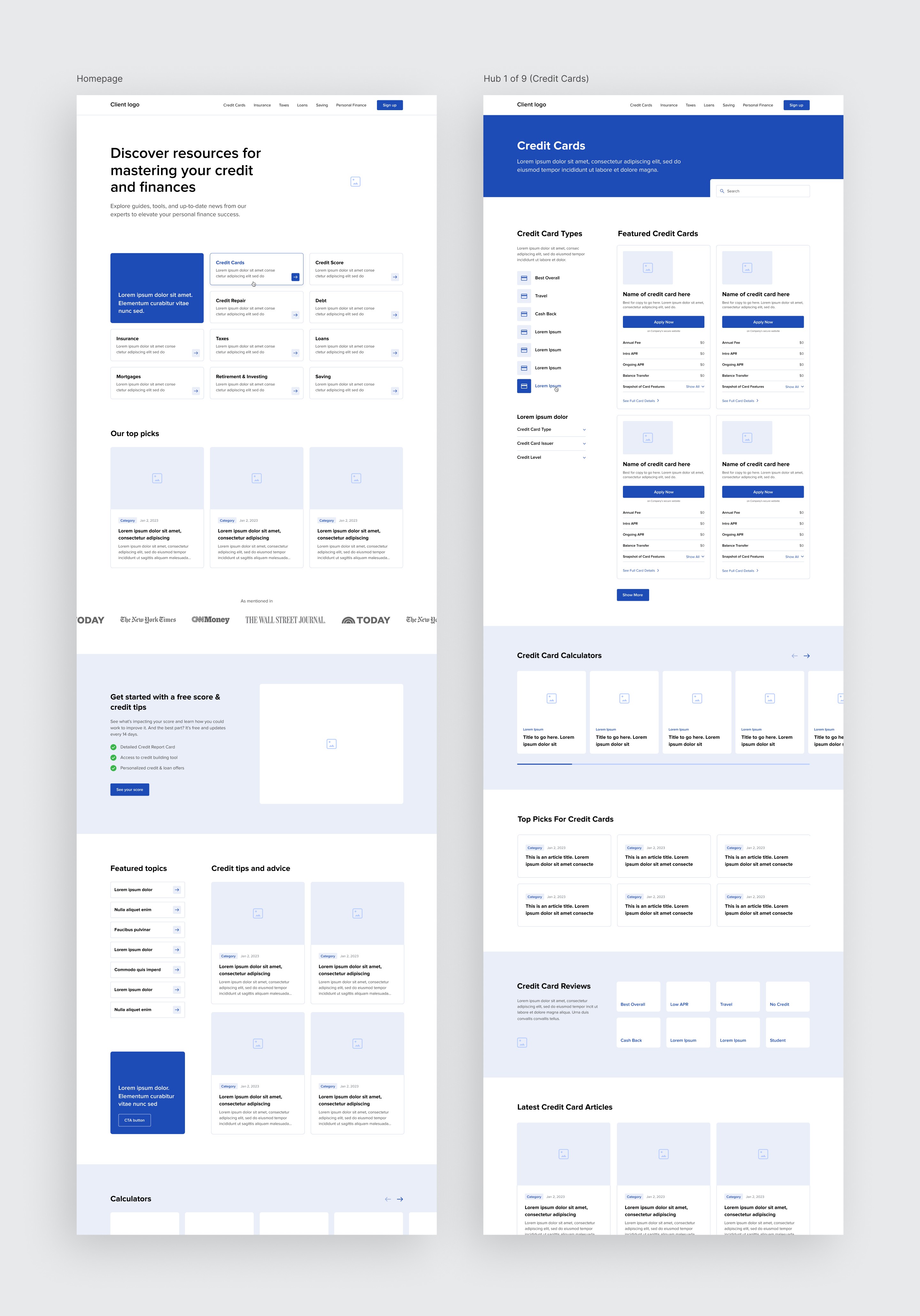 Designed scalable wireframes for a leading credit and personal finance client (similar to Bankrate). Deliverables included a homepage and a flexible component system used to build out nine high-traffic content hubs.